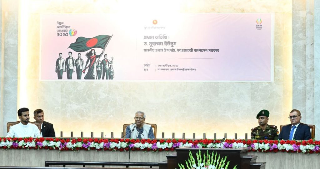 সোমবার (১৫ সেপ্টেম্বর) সকালে প্রধান উপদেষ্টার কার্যালয়ের শাপলা হলে ইয়্যুথ ভলান্টিয়ার অ্যাওয়ার্ড-২০২৫ অনুষ্ঠানে প্রধান অতিথির বক্তব্যে তিনি এ আহবান জানান।