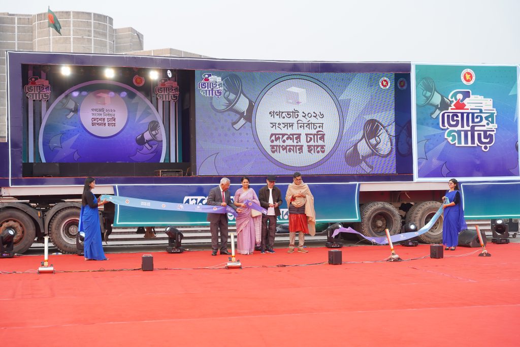 অনুষ্ঠানস্থলে উপস্থিত থেকে ফিতা কেটে ভোটের গাড়ির উদ্বোধন করেন তথ্য ও সম্প্রচার উপদেষ্টা সৈয়দা রিজওয়ানা হাসান, সংস্কৃতি উপদেষ্টা মোস্তফা সরয়ার ফারুকী, নির্বাচন কমিশন সচিবালয়ের সিনিয়র সচিব আখতার আহমেদ এবং প্রধান উপদেষ্টার প্রেস সচিব শফিকুল আলম।