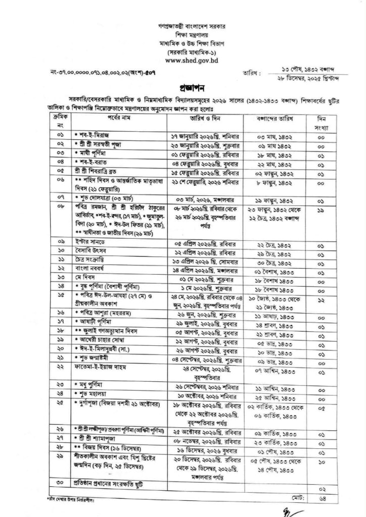 ২০২৬ সালের সরকারি ও বেসরকারি মাধ্যমিক ও নিম্নমাধ্যমিক বিদ্যালয়ের ছুটি তালিকা প্রকাশ করেছে শিক্ষা মন্ত্রণালয়। রোববার (২৮ ডিসেম্বর) মাধ্যমিক ও উচ্চশিক্ষা বিভাগের সরকারি মাধ্যমিক-১ শাখা থেকে এই তালিকা প্রকাশ করা হয়।