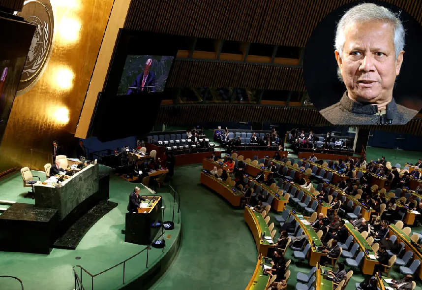 - জাতিসংঘ সাধারণ পরিষদের একটি অধিবেশন। ইনসেটে প্রধান উপদেষ্টা ড. মুহাম্মদ ইউনূস। ছবি: সংগৃহীত।