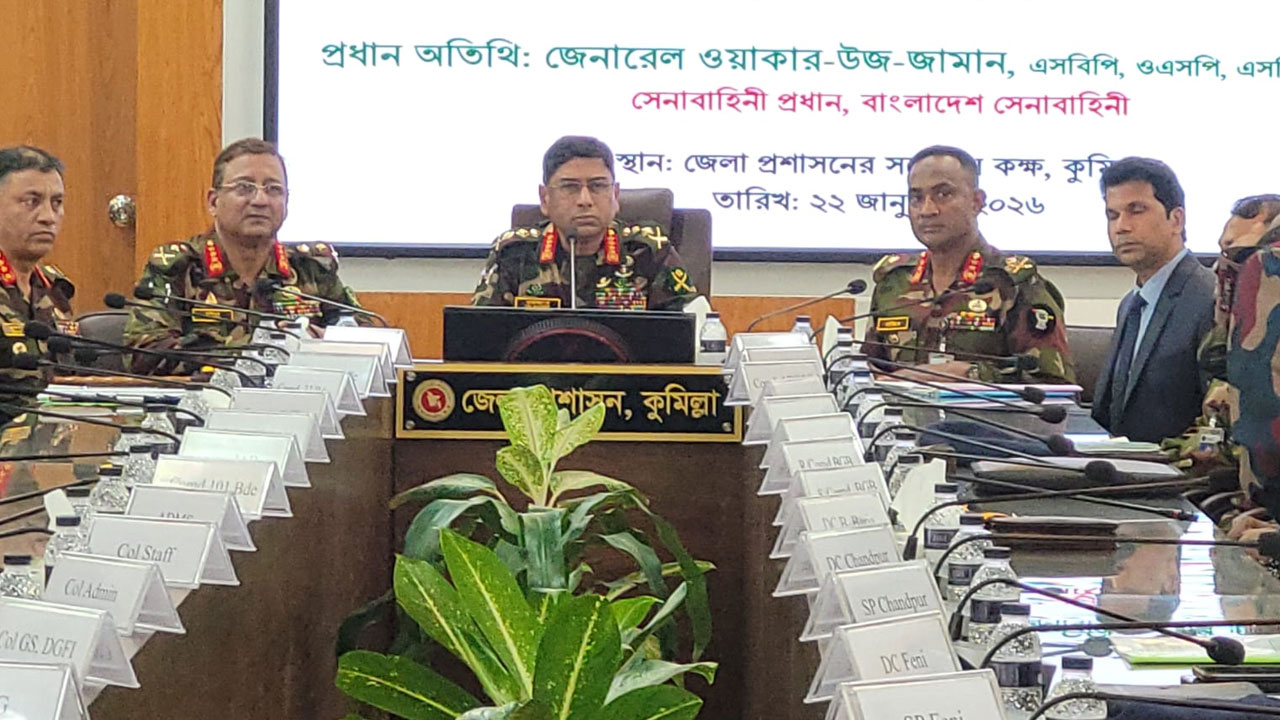 বৃহস্পতিবার (২২ জানুয়ারি) কুমিল্লা জেলা প্রশাসকের সম্মেলন কক্ষে সেনাবাহিনী প্রধান মোতায়েনকৃত সেনাসদস্যদের কার্যক্রম সরেজমিনে পর্যবেক্ষণ ও প্রয়োজনীয় দিকনির্দেশনা প্রদান এবং বেসামরিক প্রশাসনের সাথে মতবিনিময় করেন।