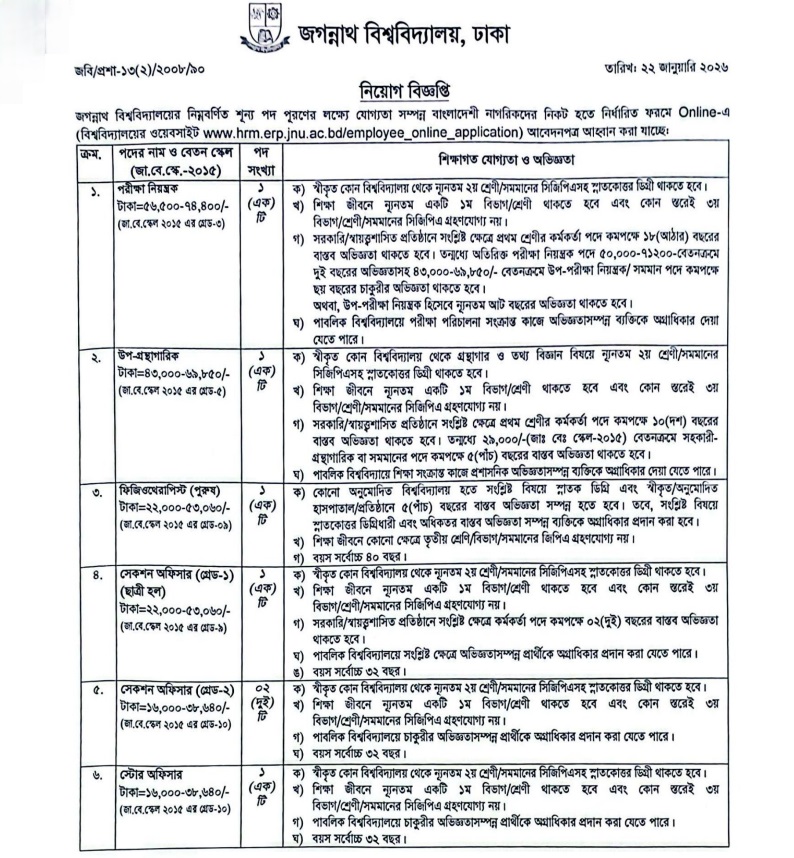 জগন্নাথ বিশ্ববিদ্যালয়ের (জবি) বিভিন্ন বিভাগ ও দপ্তরে ৬টি পদে ৭ জন কর্মকর্তা-কর্মচারী নিয়োগ দেওয়া হবে। আগ্রহী ও যোগ্য প্রার্থীরা ৫ মার্চ অফিস চলাকালীন সময় পর্যন্ত (সাপ্তাহিক ও ছুটির দিন ব্যতিত) আবেদন করতে পারবেন। আবেদনপত্র সরাসরি/ডাকযোগে/কুরিয়ার সার্ভিসের মাধ্যমে পাঠাতে হবে।