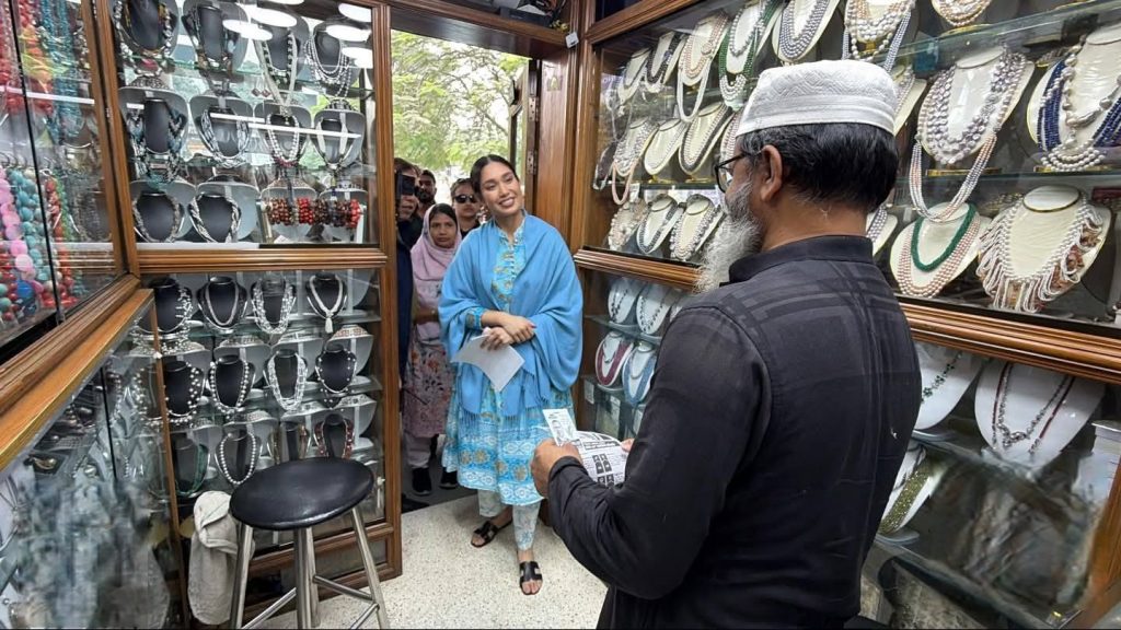 পথচারী, রিকশাচালক, সিএনজিচালক, দোকানি, ফুটপাতের বিক্রেতা এবং শপিং মলে আসা ভোটারদের সঙ্গে কথা বলেন এবং তাদের হাতে নির্বাচনী লিফলেট তুলে দেন।