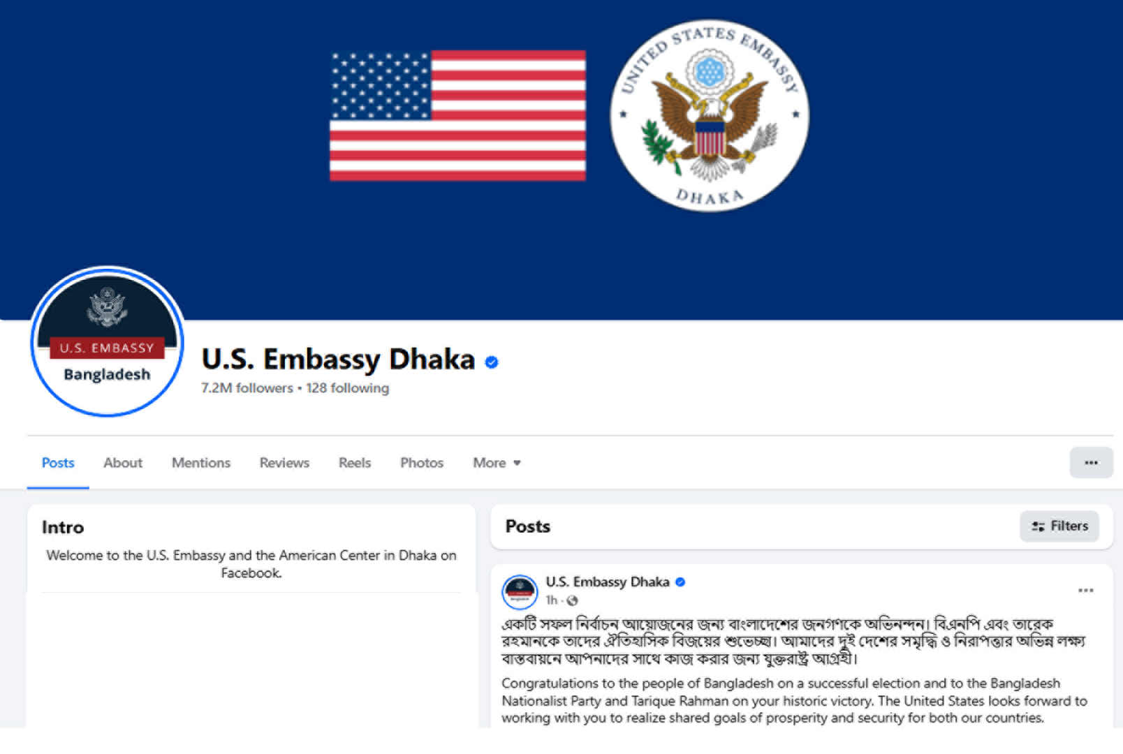 পোস্ট উল্লেখ করা হয়, একটি সফল নির্বাচন আয়োজনের জন্য বাংলাদেশের জনগণকে অভিনন্দন। বিএনপি এবং তারেক রহমানকে তাদের ঐতিহাসিক বিজয়ের শুভেচ্ছা। আমাদের দুই দেশের সমৃদ্ধি ও নিরাপত্তার অভিন্ন লক্ষ্য বাস্তবায়নে আপনাদের সঙ্গে কাজ করার জন্য যুক্তরাষ্ট্র আগ্রহী।