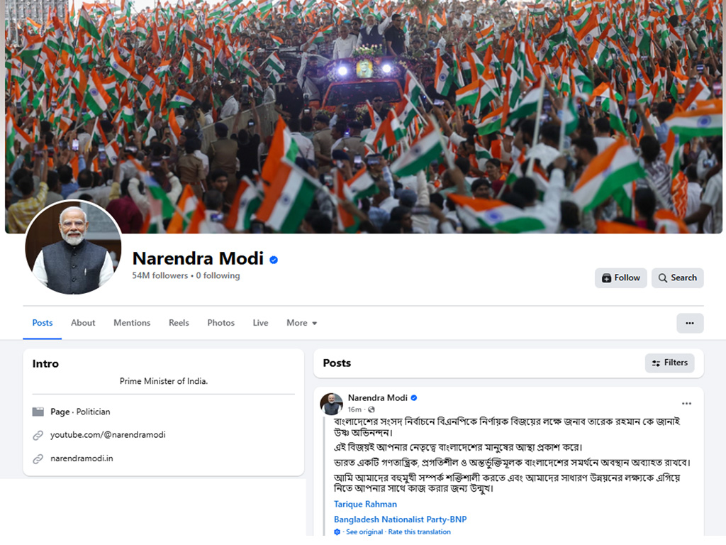 ত্রয়োদশ জাতীয় সংসদ নির্বাচন ২০২৬ তারেক রহমানের নেতৃত্বে বিএনপি সংখ্যাগরিষ্ঠ আসন পাওয়ায় সরকার গঠনের পথে আর কোন বাধা নেই। বিএনপির এই বিজয়ে শুভেচ্ছা জানিয়ে বাংলাদেশের সঙ্গে সম্পর্ক উন্নয়নে আগ্রহী ভারত। নিজের ভেরিভায়েড ফেসবুক পেজে এমনটাই জানিয়েছেন দেশটির প্রধানমন্ত্রী নরেন্দ্র মোদি।