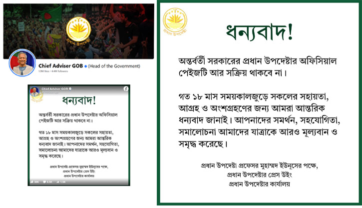 প্রধান উপদেষ্টা অধ্যাপক মুহাম্মদ ইউনূসের পক্ষে পেজটি বন্ধের ঘোষণা দিয়ে একটি ফটোকার্ডে বলা বলা হয়েছে, অন্তর্বর্তী সরকারের প্রধান উপদেষ্টার অফিসিয়াল ফেসবুক পেজটি আর সক্রিয় থাকবে না।