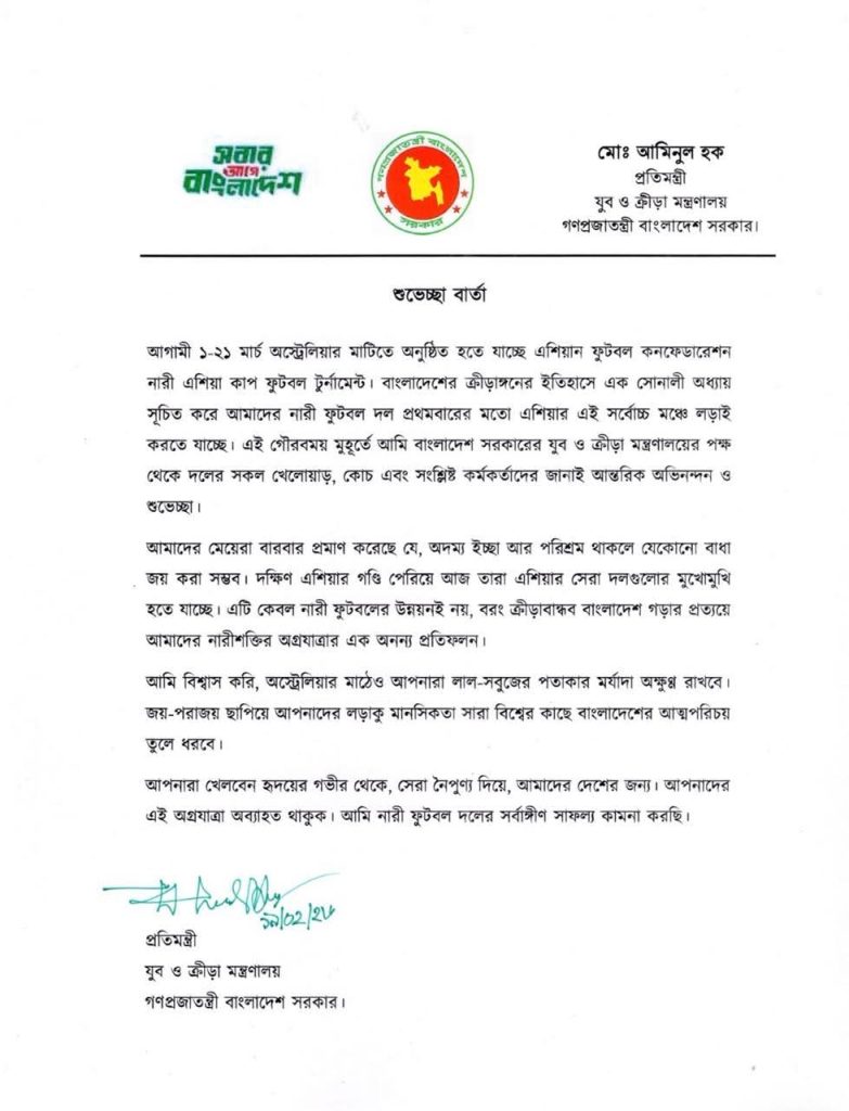 শুভেচ্ছা বার্তায় যুব ও ক্রীড়া প্রতিমন্ত্রী বলেন, “অদম্য ইচ্ছাশক্তি, কঠোর পরিশ্রম ও দৃঢ় মনোবল দিয়ে আমাদের মেয়েরা বারবার প্রমাণ করেছে-যেকোনো বাধা অতিক্রম করা সম্ভব। দক্ষিণ এশিয়ার গণ্ডি পেরিয়ে আজ তারা এশিয়ার সেরা দলগুলোর মুখোমুখি হতে যাচ্ছে। এটি শুধু নারী ফুটবলের উন্নয়ন নয়, বরং ক্রীড়াবান্ধব বাংলাদেশ গড়ার প্রত্যয়ে নারীশক্তির অগ্রযাত্রার এক অনন্য প্রতিফলন।”