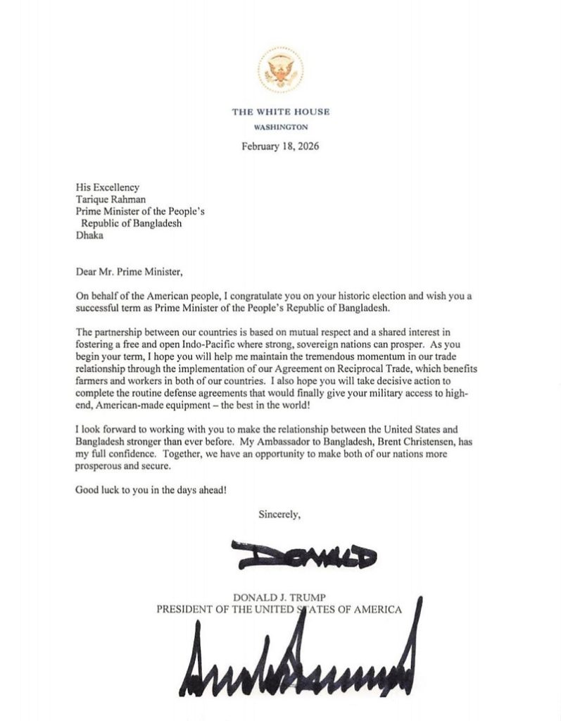 বাংলাদেশের ১১তম প্রধানমন্ত্রী হিসেবে দায়িত্ব গ্রহণের জন্য বিএনপির চেয়ারম্যান তারেক রহমানকে অভিনন্দন জানিয়েছেন মার্কিন প্রেসিডেন্ট ডোনাল্ড ট্রাম্প। বুধবার (১৮ ফেব্রুয়ারি) তারেক রহমানের কাছে লেখা এক চিঠিতে অভিনন্দন জানানো হয়। চিঠিতে আমেরিকান জনগণের পক্ষ থেকে প্রধানমন্ত্রীর ঐতিহাসিক এই বিজয়ে শুভেচ্ছা ও সফলতা কামনা করা হয়।