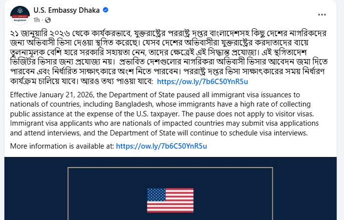 বাংলাদেশসহ নির্দিষ্ট কিছু দেশের নাগরিকদের জন্য অভিবাসী ভিসা প্রদান স্থগিত করার ঘোষণা দিয়েছে যুক্তরাষ্ট্রের পররাষ্ট্র দপ্তর। গত ২১ জানুয়ারি ২০২৬ থেকে এই সিদ্ধান্ত কার্যকর করা হয়েছে। সোমবার (২ মার্চ) সকালে ফেসবুকে এক পোস্টে এসব তথ্য জানিয়েছে বাংলাদেশের মার্কিন দূতাবাস।