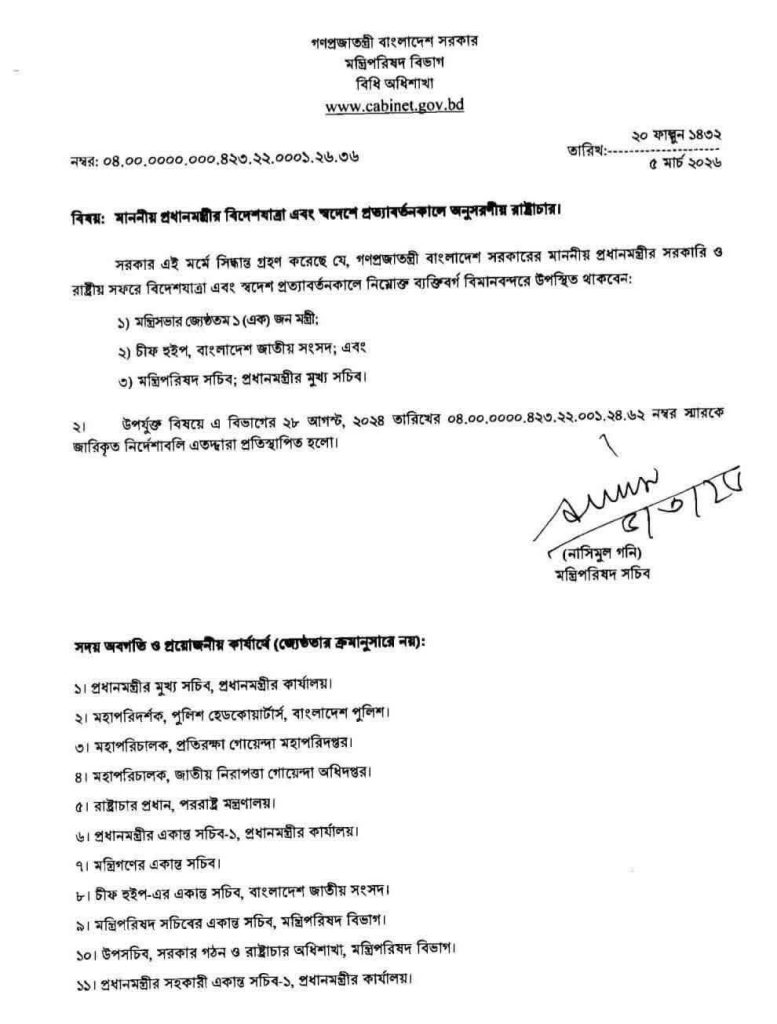 প্রজ্ঞাপনে বলা হয়, সরকার এ মর্মে সিদ্ধান্ত গ্রহণ করেছে যে, গণপ্রজাতন্ত্রী বাংলাদেশ সরকারের মাননীয় প্রধানমন্ত্রীর সরকারি ও রাষ্ট্রীয় সফরে বিদেশযাত্রা এবং স্বদেশ প্রত্যাবর্তনকালে নিম্নোক্ত ব্যক্তিবর্গ বিমানবন্দরে উপস্থিত থাকবেন: মন্ত্রিসভার জ্যেষ্ঠতম একজন মন্ত্রী; চিফ হুইপ, বাংলাদেশ জাতীয় সংসদ; মন্ত্রিপরিষদ সচিব এবং প্রধানমন্ত্রীর মুখ্য সচিব।