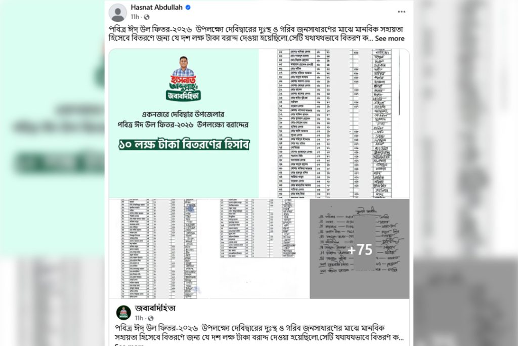 মঙ্গলবার (২৪ মার্চ) মধ্যরাতে নিজের ভেরিফায়েড ফেসবুক আইডি এবং ‘জবাবদিহিতা’ নামের পেজে তিনি পোস্টে জানিয়েছেন, উপজেলার ১৫টি ইউনিয়ন ও ১টি পৌরসভার মোট ১৪৪টি ওয়ার্ডে এই সহায়তা পৌঁছে দেয়া হয়েছে। তবে ব্যক্তিগত তথ্যের নিরাপত্তার জন্য এনআইডি নম্বর এবং মোবাইল নম্বর ঢেকে রাখা হয়েছে। প্রশাসনিক অনুসন্ধানের জন্য যেকোনো তথ্য উন্মুক্তযোগ্য রাখা হয়েছে।