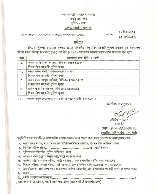 সরকারি চাকরি থেকে হঠাৎ চারজন শিক্ষানবিশ সহকারী পুলিশ সুপারকে (এএসপি) বহিষ্কার করা হয়েছে। এই সিদ্ধান্ত বুধবার (২৫ মার্চ) স্বরাষ্ট্র মন্ত্রণালয়ের পুলিশ-১ শাখার প্রজ্ঞাপনের মাধ্যমে প্রকাশ করা হয়।