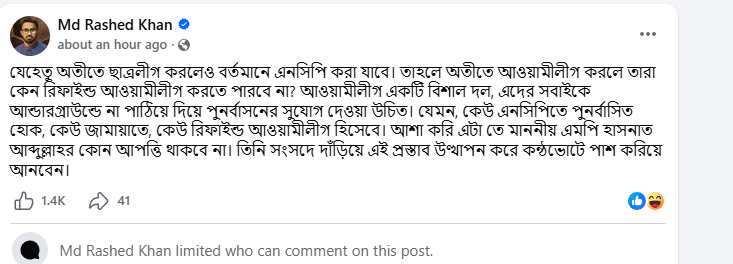 পোস্টে রাশেদ খান লেখেন, ‘যেহেতু অতীতে ছাত্রলীগ করলেও বর্তমানে এনসিপি করা যাবে। তাহলে অতীতে আওয়ামী লীগ করলে তারা কেন রিফাইন্ড আওয়ামী লীগ করতে পারবে না? আওয়ামী লীগ একটি বিশাল দল, এদের সবাইকে আন্ডারগ্রাউন্ডে না পাঠিয়ে দিয়ে পুনর্বাসনের সুযোগ দেওয়া উচিত।’