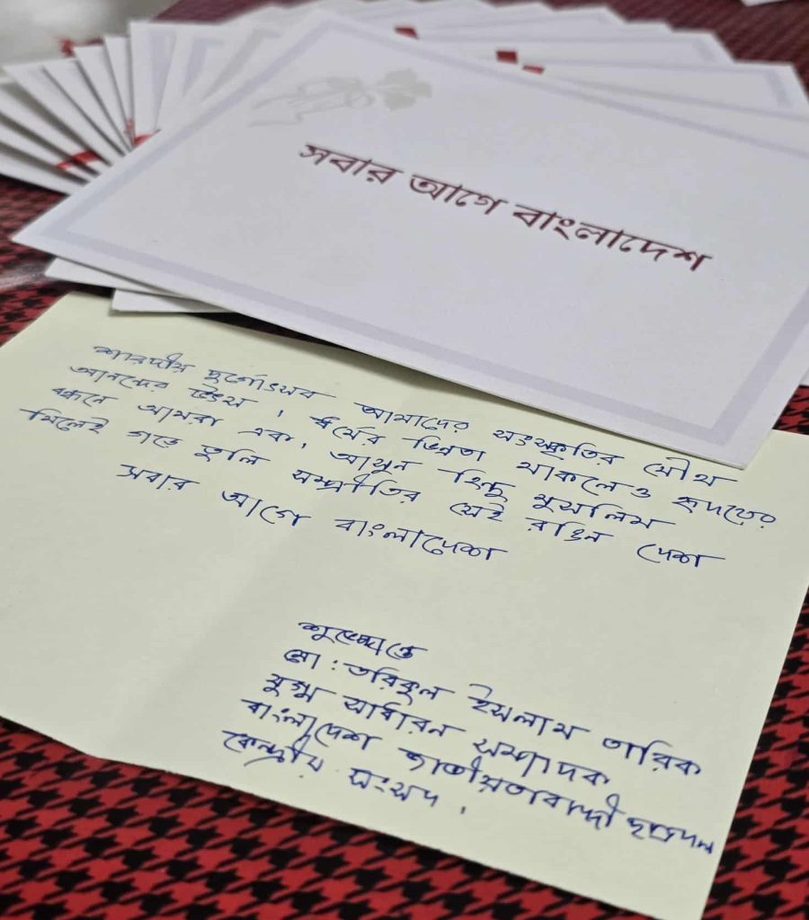 শুভেচ্ছা বার্তায় লেখা রয়েছে- ‘শারদীয় দুর্গোৎসব আমাদের সংস্কৃতির যৌথ আনন্দের উৎস। ধর্মের ভিন্নতা থাকলেও হৃদয়ের বন্ধনে আমরা এক। আসুন মুসলিম-হিন্দু মিলেই তৈরি করি সম্প্রীতির সেই রঙিন দেশ। সবার আগে বাংলাদেশ