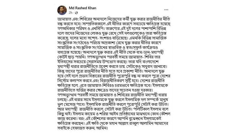 তিনি লিখেছেন, ‘জামায়াত এবং শিবিরের অন্যদলে নিজেদের কর্মী যুক্ত করার রাজনীতির নীতি বন্ধ করতে হবে। সাম্প্রতিককালে এই নীতির কারণে সবচেয়ে ক্ষতিগ্রস্ত হয়েছে গণঅধিকার পরিষদ ও এনসিপি। তারুণ্যের এই দুই দলের পাশাপাশি বিভিন্ন দলে তাদের নিজেদের লোকও যুক্ত রেখে সেই দলগুলোকেও তারা ক্ষতিগ্রস্ত করেছে, দলের মধ্যে সন্দেহ-সংশয়ও বাড়িয়েছে।’