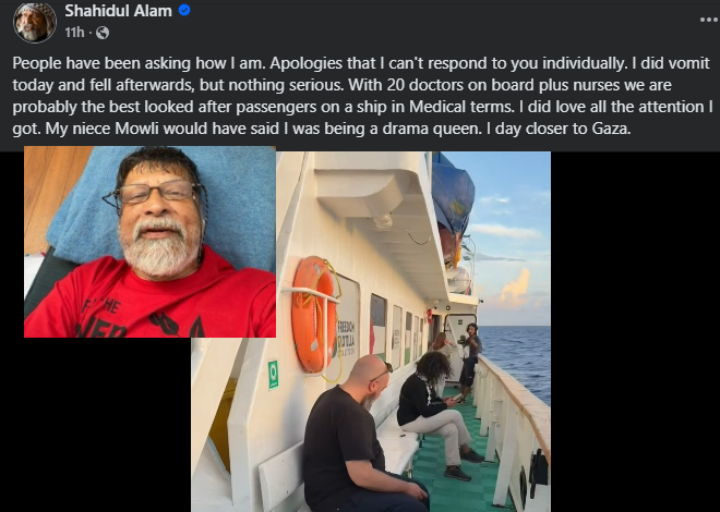 এর আগে, শুক্রবার (৩ অক্টোবর) এক পোস্টে, শহীদুল জাহাজের ডেক থেকে কথা বলেছিলেন, আশেপাশের দৃশ্য শেয়ার করেছিলেন এবং সহযাত্রীদের সাথে কথোপকথন করছিলেন। তার প্রথম ভিডিওটি কেবিনের ভেতরে রেকর্ড করা হয়েছিল, যেখানে তিনি বলেছিলেন যে উত্তাল সমুদ্র তাকে কিছুটা অসুস্থ বোধ করছে। পরে, শহিদুল পোস্ট করেছেন যে অনেকেই তার স্বাস্থ্যের জন্য উদ্বেগ প্রকাশ করেছেন কিন্তু তিনি সবার সাথে আলাদাভাবে সাড়া দিতে পারেননি। তবে বর্তমানে তিনি কনশানস নৌযানটিতে আছেন।