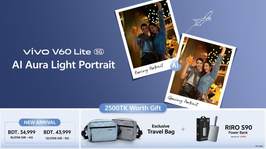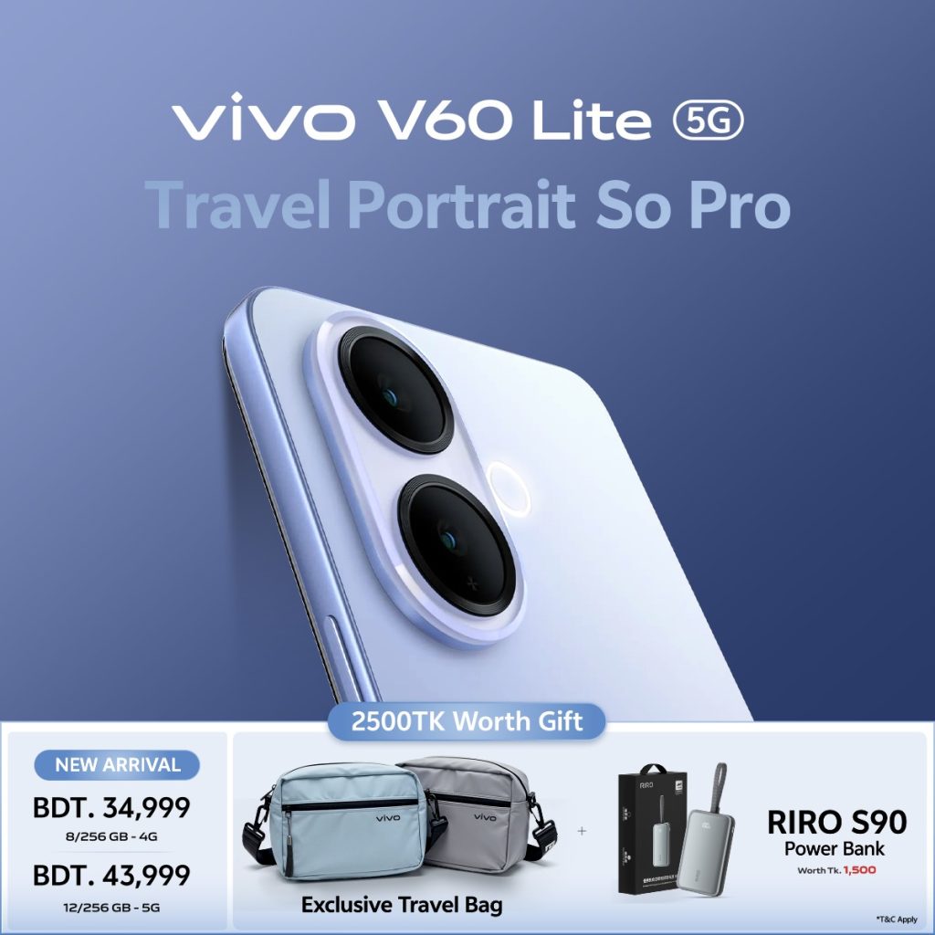 আকর্ষণীয় অফারের সাথে বাজারে এসেছে ভিভো ভি৬০ লাইট। ফাইভজি এবং ফোরজি দুটি সংস্করণে ফোনের দাম যথাক্রমে ৪৩,৯৯৯ টাকা ও ৩৪,৯৯৯ টাকা। ক্রেতারা পাচ্ছেন ২৫০০ টাকার বিশেষ গিফট প্যাক জেতার সুযোগ, যাতে রয়েছে স্টাইলিশ ট্রাভেল ব্যাগ এবং রিরো এস৯০ পাওয়ার ব্যাংক। এছাড়া, ক্রেডিট কার্ড ছাড়াই মাত্র ৭,০০০ টাকা থেকে মোমো কিস্তিতে ফোনটি কেনা যাবে।