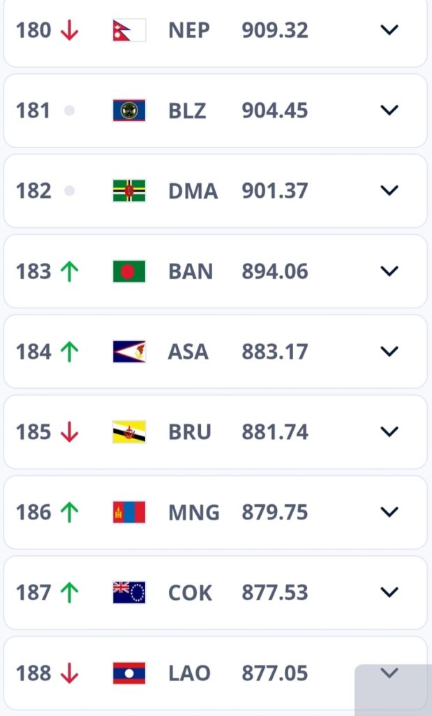 দক্ষিণ এশিয়ার মধ্যে সবচেয়ে বেশি এগিয়েছে শ্রীলঙ্কা। চারধাপ এগিয়ে দলটির অবস্থান এখন ১৯৩। চারধাপ নেপাল ও দুই ধাপ পিছিয়েছে মালদ্বীপ। দল দুটির অবস্থান যথাক্রমে ১৮০ ও ১৭৩তম স্থানে। দক্ষিন এশিয়ার বাকি দুই দেশ ভুটান ১৮৯ ও পাকিস্তান আছে ১৯৮তম স্থানে।