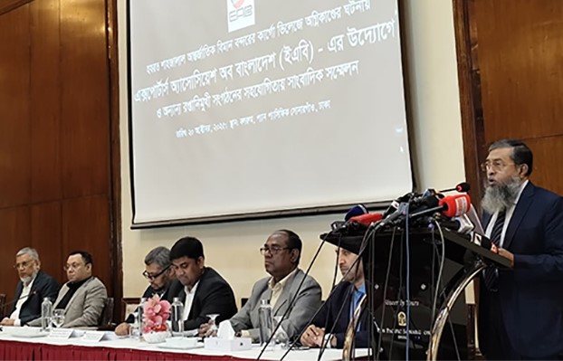 কার্গো ভিলেজে আগুনে ক্ষতির ঘোষণা অনুষ্ঠানে, ইএবি এবং বিকেএমইএ’র নেতারা। ছবি: সংগৃহীত।