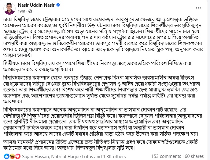 ডাকসু নেতাদের আচরণ নিয়ে ছাত্রদলের নাছিরের স্ট্যাটাস