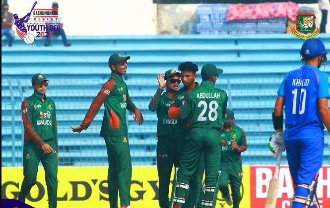 সিরিজের পঞ্চম ও শেষ যুব ওয়ানডেতে রোববার (৯ নভেম্বর) আফগানিস্তানকে ২ উইকেটে হারায় বাংলাদেশ। ২০৯ রানের লক্ষ্য তারা পূরণ করে ২৫ বল বাকি থাকতে। এই জয়ে ৫ ম্যাচের সিরিজ শেষ হলো ২-২ সমতায়। সিরিজের দ্বিতীয় ম্যাচ বৃষ্টিতে পরিত্যক্ত হয়। আফগানিস্তানের হয়ে ওয়াহিদুল্লাহ জাদরান ২৫ রানে নেন ৪ উইকেট।