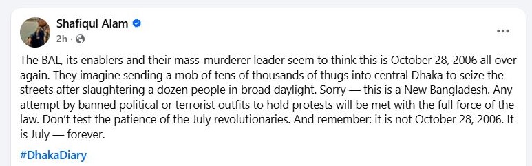 তিনি আরও লেখেন, ‘জুলাই বিপ্লবীদের ধৈর্য পরীক্ষা করবেন না এবং মনে রাখবেন– এটি ২০০৬ সালের ২৮ অক্টোবর নয়। এটি জুলাই, চিরদিনের জুলাই।’