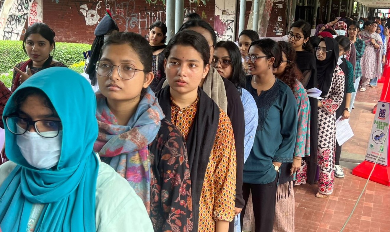 - ডাকসু নির্বাচনে ভোটাদের দীর্ঘ সারি। ছবি: সংগৃহীত।