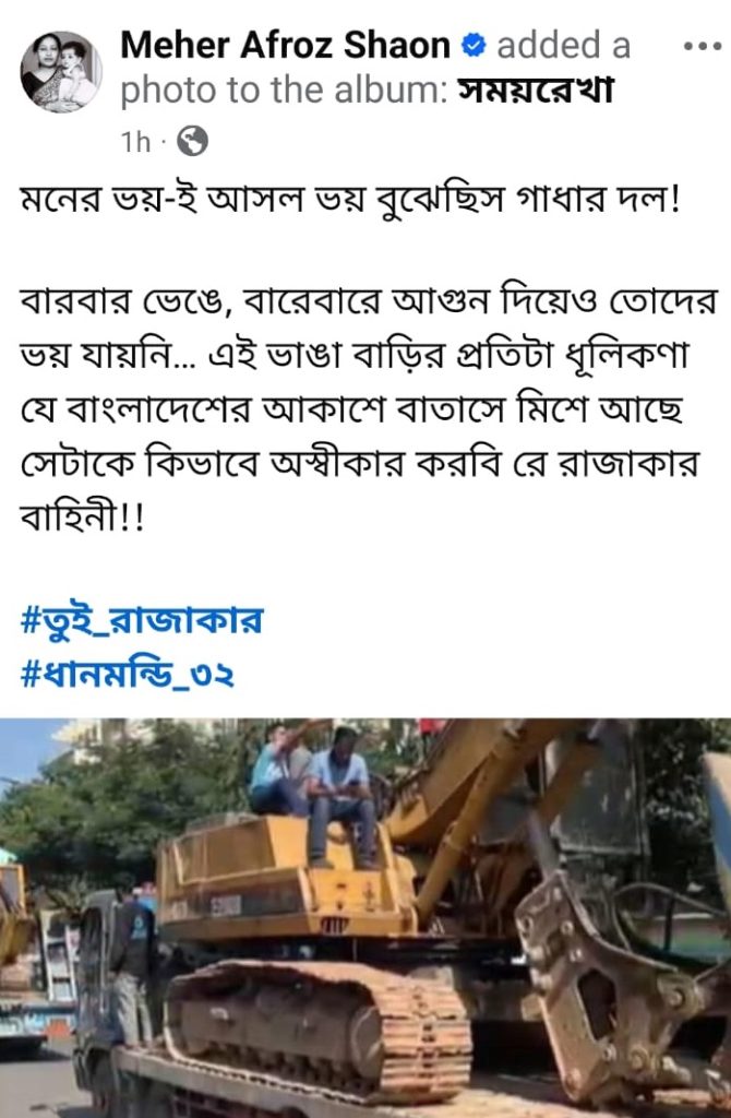 এই ঘটনার পর অভিনেত্রী মেহের আফরোজ শাওন তাদের ‘রাজাকার বাহিনী’ বলে আখ্যা দিয়েছেন। তিনি একটি সংবাদ শেয়ার করে লিখেছেন, ‘মনের ভয়ই আসল ভয়। বারবার ভাঙা, আগুন দেওয়ার পরও তোদের ভয় যায়নি। ধানমন্ডি ৩২-এর এই ভাঙা বাড়ির প্রতিটি ধূলিকণা বাংলাদেশের আকাশে মিশে আছে। একে কীভাবে অস্বীকার করবে, রাজাকার বাহিনী!’