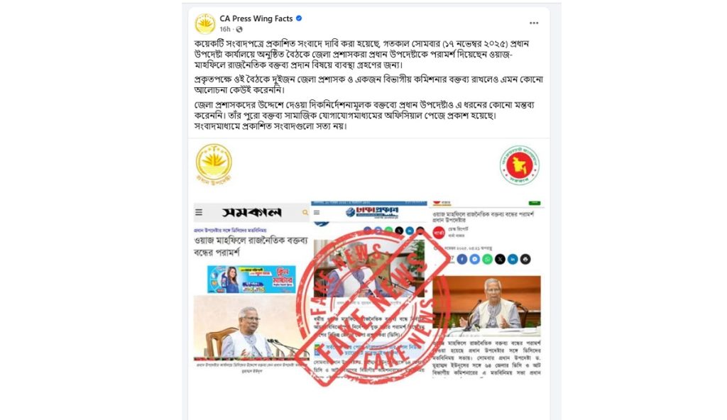 এ নিয়ে সিএ প্রেস উইং ফ্যাক্টস এক ফেসবুক পোস্টে জানিয়েছে, কয়েকটি সংবাদপত্রে প্রকাশিত সংবাদে দাবি করা হয়েছে, সোমবার (১৭ নভেম্বর) প্রধান উপদেষ্টা কার্যালয়ে অনুষ্ঠিত বৈঠকে জেলা প্রশাসকরা প্রধান উপদেষ্টাকে পরামর্শ দিয়েছেন ওয়াজ-মাহফিলে রাজনৈতিক বক্তব্য প্রদান বিষয়ে ব্যবস্থা গ্রহণের জন্য। প্রকৃতপক্ষে ওই বৈঠকে দুইজন জেলা প্রশাসক ও একজন বিভাগীয় কমিশনার বক্তব্য রাখলেও এমন কোনো আলোচনা কেউই করেননি।